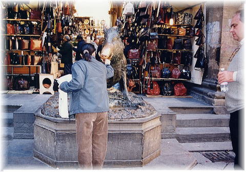 ミケランジェロ広場からの帰りに出会ったおちゃめなダルメシアン 置物かと思った。 新市場のロッジア ここの猪の口にコインを入れて、 落ちた時に金網をすり抜けて下へ落ちたら願いがかなうという。 …落ちなかったので、自分で押し込みました。 願いは自分で叶えろ、ってことか…。