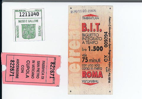 チケットの数々 オレンジ色が地下鉄、白地に緑がバチカン美術館、 ピンクがクーポラのチケット