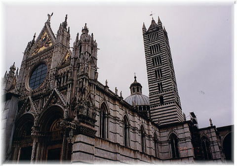 シエナのドゥオモ 鐘楼の窓が上に行くにしたがって数が増えていくのは、 バランスよく塔が高く見えるようにってことらしい。