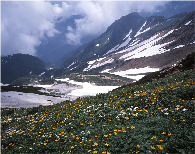 中部地方は、日本の屋根が連なっています。花も山岳地帯の花風景が中心となりました。高山は装備が増えるために、撮影も重労働が課せられます。それに情報を頼りに出かけても、自然環境や気象条件に大きく左右され、ベストシーンに遭遇できるのは少ないことです。しかしこのシナノキンバイは偶然でした。