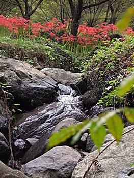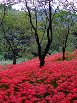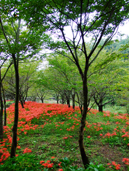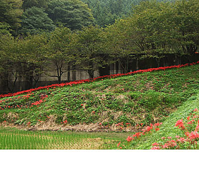 県道207号線を久谷方面に進むとアサヒ動物霊園の標識が随所に見えてくるので指示に従い、どんどん奥に進む。どんどん奥に進むと彼岸花の群生が見えてくる。駐車場2台まで。 | ![]() |