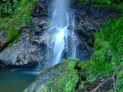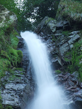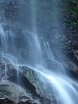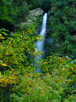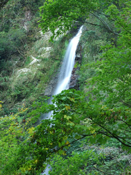 | 日本の滝100選にも選ばれており、ダイナミックである。前日雨でもないのにこの水量は嬉しい。しかし、その美しさに反して、運転に自信のない私には2度と行きたくない滝100選に選んでしまいそうだ。行きの山道が非常に怖かったのだ。崖が左側なのでびくびくしながらの運転になる。しかも前から車が来る。100選滝ということで訪れる人も多い。15時過ぎてたのでゆっくりすることが出来なかった。日が暮れたら道中危険なので。 京都から来た、さすらいの滝人さんにお会いすることが出来た。とてもきさくな方で、秘境の御来光の滝への行き方を教えて頂いた上に、下りの先導も引き受けてくれた。こうして滝名人に会えるのは嬉しい。 |